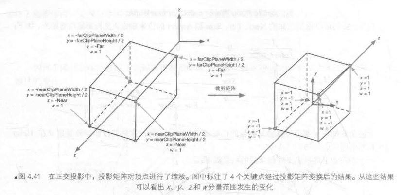 前面讲到,我们希望根据视锥体围成的区域对图元进行裁剪,但是,如果直接使用视锥体定义的空间来进行裁剪,那么不同的视锥体就需要不同的处理过程,而且对于透视投影的视锥体来说,想要判断一个顶点是否处于一个金字塔内部是比较麻烦的。因此,我们想用一种更加通用、方便和整洁的方式来进行裁剪的工作,这种方式就是通过一个投影矩阵把顶点转换到一个裁剪空间中。在裁剪空间之前,虽然我们使用了齐次坐标来表示点和矢量,但它们的第四个分量都是固定的:点的w分量是1,方向矢量的w分量是0。经过投影矩阵的变换后,我们就会赋予齐次坐标的第四个坐标更加丰富的含义。